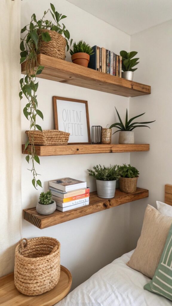 Keep the shelves organized and clutter-free for a clean look. Open shelving works well in small bedrooms or minimalist spaces. It’s a great way to maximize vertical space.