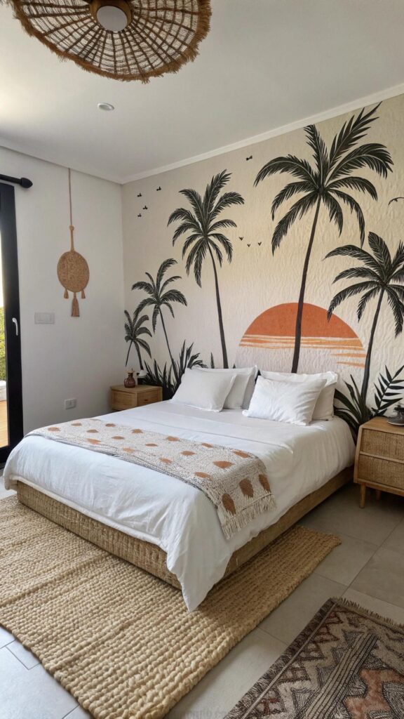 Bring the tropics into your bedroom with vibrant wall art. Choose prints featuring palm leaves, exotic flowers, or beach scenes to create a summer-inspired focal point. This is an easy way to add color and personality to your space.