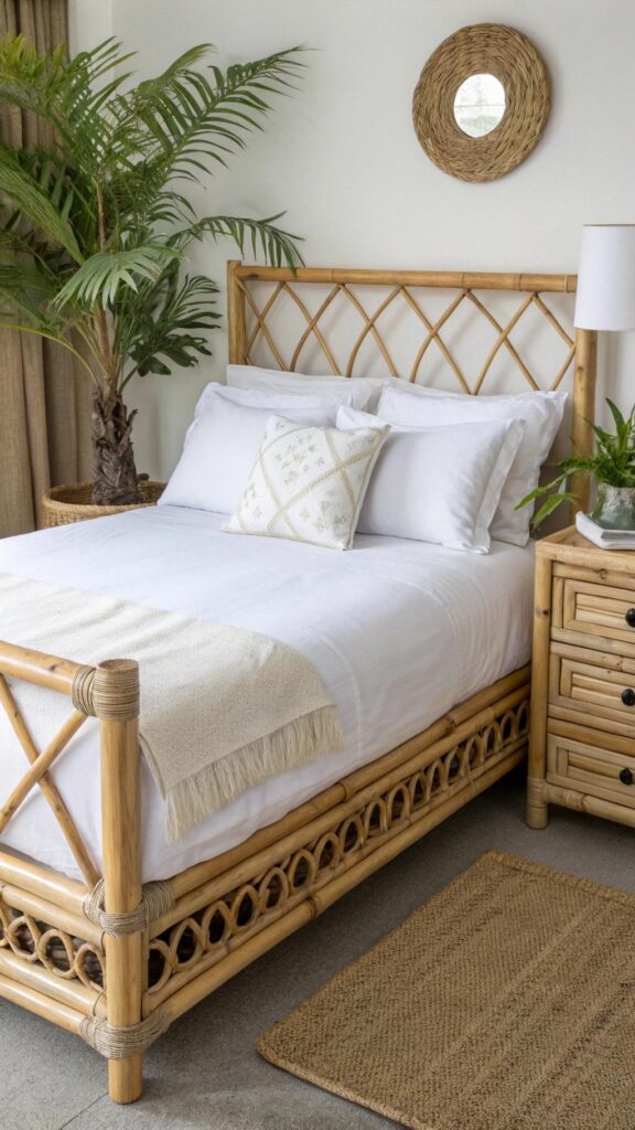 Pair bamboo furniture with light-colored textiles and greenery for a cohesive look. Bamboo works well in both tropical and minimalist decor styles. It’s a versatile choice for summer bedroom decor.