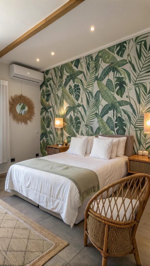 Make a statement with bold wallpaper. Choose a summer-inspired design like tropical leaves, floral patterns, or geometric shapes. This adds personality and depth to your bedroom.