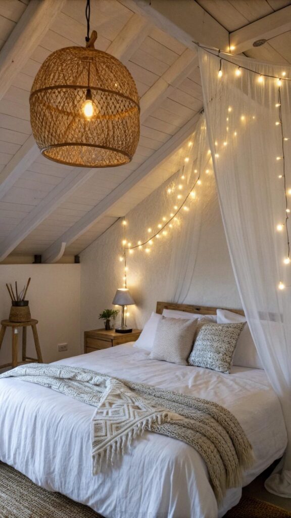 Place string lights around your headboard or window for a cozy effect. Summer lighting works well in boho or eclectic bedrooms. It’s a simple way to set the mood.