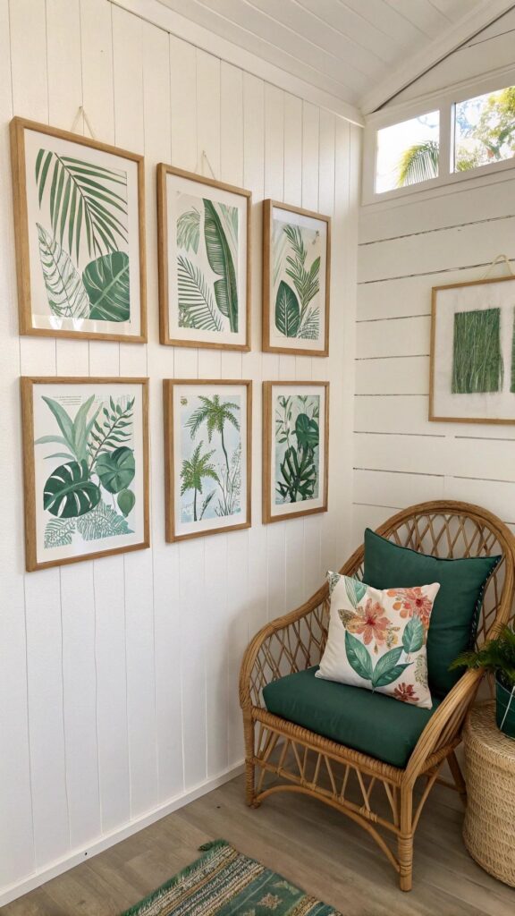 You can also create a gallery wall with a mix of tropical prints and framed photos. Use lightweight frames in natural materials like bamboo or rattan to enhance the summer vibe. This decor idea works well for both large and small bedrooms.