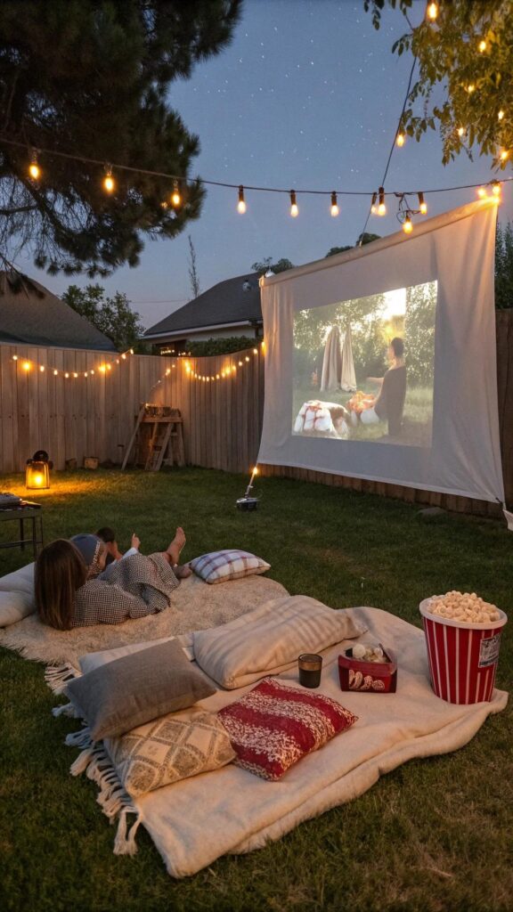 Serve popcorn, candy, and drinks in themed containers. Add string lights or lanterns for a magical touch. Your guests will love this relaxed and entertaining setup.
