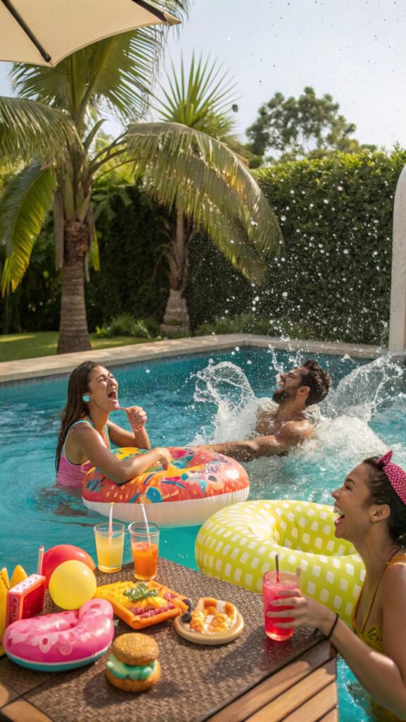 For food, consider a BBQ or light snacks like fruit skewers and finger sandwiches. Add some music and a waterproof Bluetooth speaker to keep the vibe lively. Don’t forget sunscreen and towels for your guests!