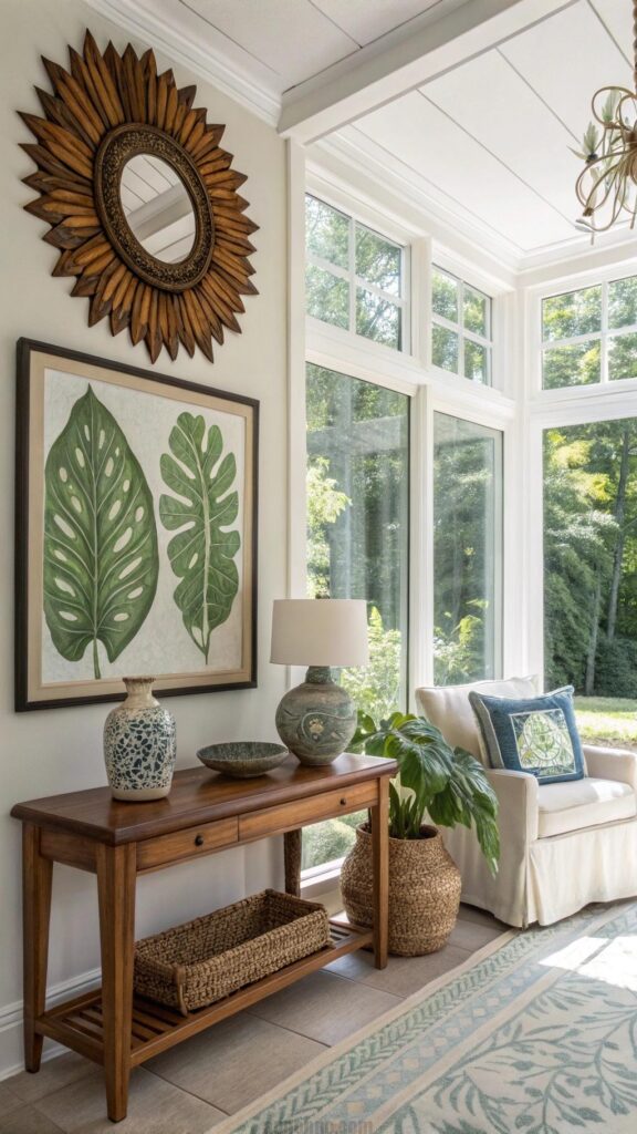 Add decorative objects like sculptures, vases, or unique pottery to tabletops and shelves. These small touches contribute to the room’s character and make it feel more lived-in. Curated decor elevates the overall design of your sunroom.