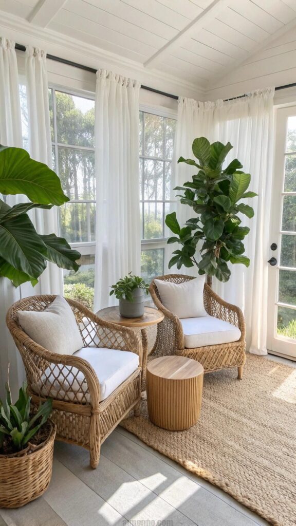 Opt for light colors such as white, cream, or pastels to maintain the bright and open feel of the sunroom. These colors reflect light, making the space appear larger and more luminous. Sheer curtains are a practical and beautiful choice for any sunroom.