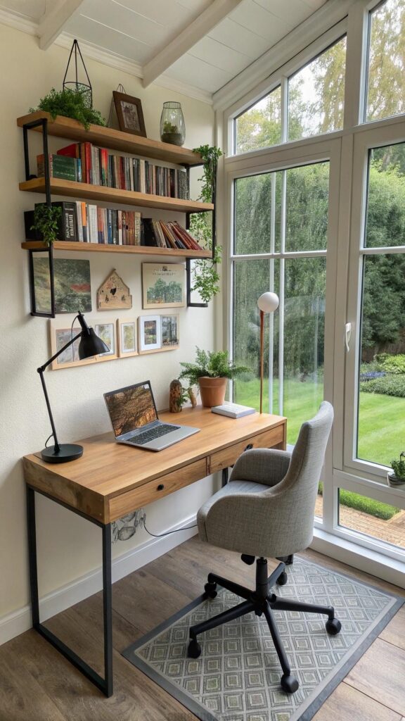 Keep office supplies organized with stylish storage solutions like wall-mounted shelves or a small filing cabinet. Integrate plants and natural elements to create a calming and productive environment. This setup can boost creativity and reduce eye strain.