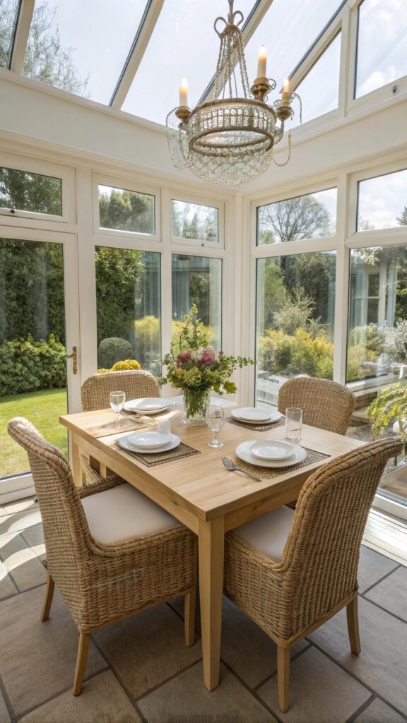 Consider a light-colored palette for your dining set to enhance the airy feel of the sunroom. Adding a small buffet or console table provides extra storage for dishes and serving essentials. This setup allows you to enjoy meals with a view of your garden or surroundings.