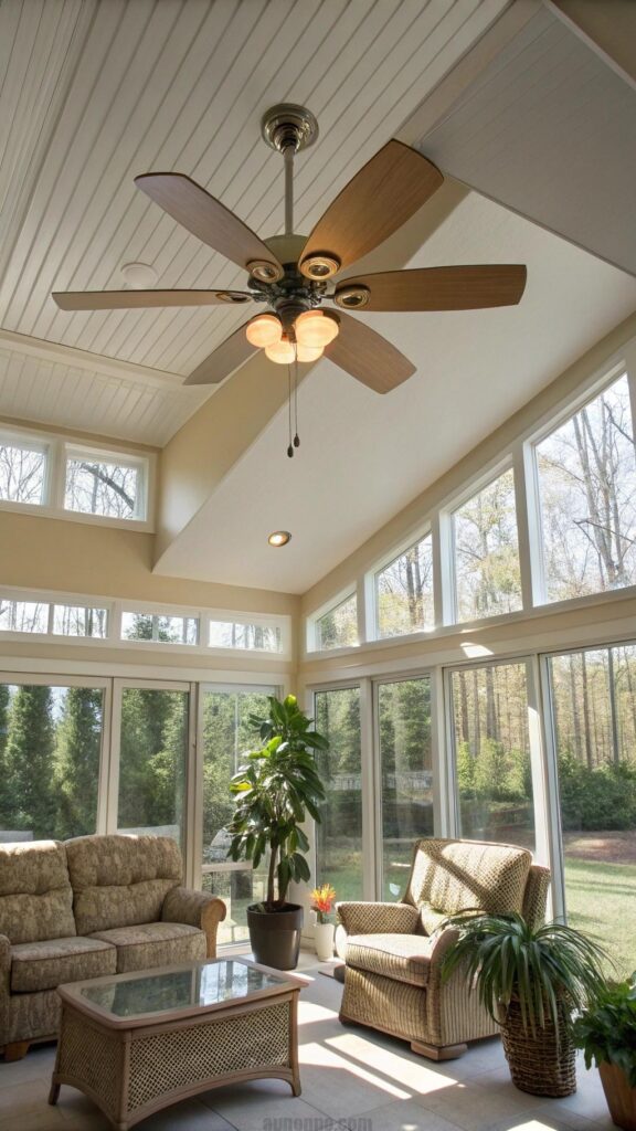 Consider a damp-rated fan if your sunroom is exposed to high humidity or occasional moisture. A well-chosen ceiling fan enhances comfort and extends the usability of your sunroom throughout the year. It is a functional element that contributes to the room’s overall appeal.