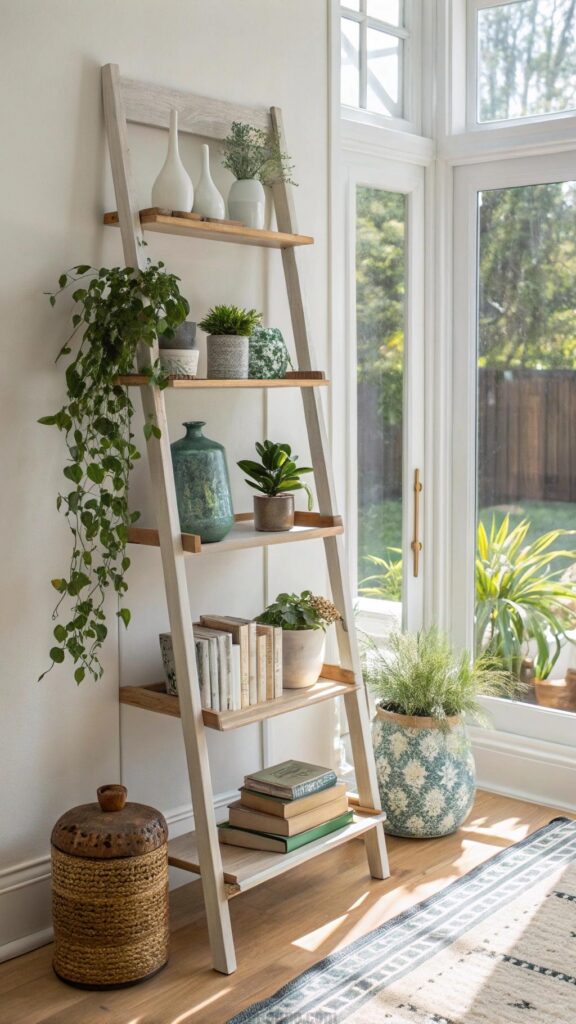 Consider a tall, narrow bookshelf or a ladder shelf to add visual interest and functionality. These units provide ample space for organizing and displaying your favorite collections. They keep the floor clear, contributing to an open and airy feel.