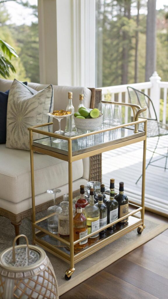 A bar cart adds a touch of sophistication and convenience to your sunroom. It can be easily moved to different areas as needed, making it versatile for various gatherings. Stock it with your favorite drinks and some fresh garnishes for an inviting display.