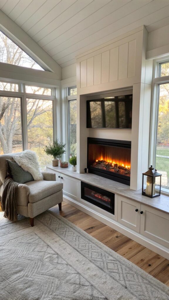 Extend the usability of your sunroom into cooler months by adding a fireplace or a portable heater. A small electric fireplace can provide warmth and a cozy ambiance without the need for ventilation. This creates a comfortable environment for year-round enjoyment.