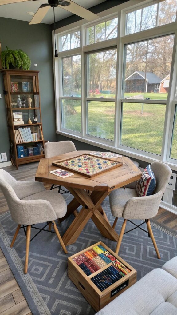 Consider storage solutions for game boards, puzzles, and hobby supplies to keep the area tidy. A portable cart or a small cabinet can hold everything neatly. The natural light is ideal for detailed work, reducing eye strain.
