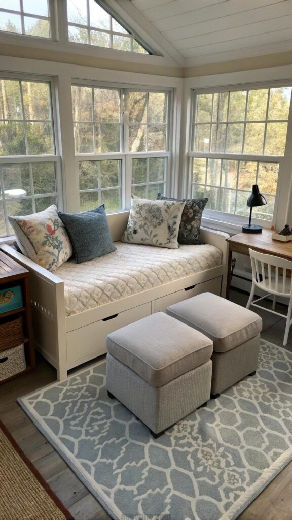 If your sunroom is not large enough for a single dedicated purpose, consider designing it as a multi-functional space. Use furniture that can serve multiple roles, such as a daybed that functions as both seating and an extra sleeping area. Ottomans with storage can hide clutter and provide additional seating.