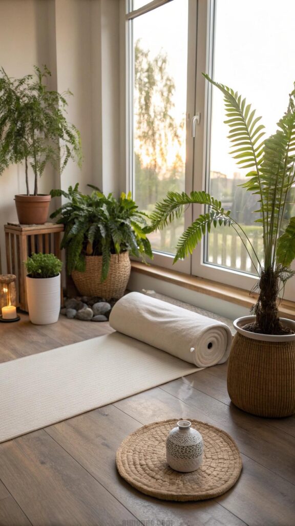 Keep the decor minimal and serene, focusing on calming colors and natural textures. Add elements like indoor plants, a small water feature, or soothing aromatherapy diffusers to enhance the tranquil atmosphere. This dedicated space promotes relaxation and inner peace.