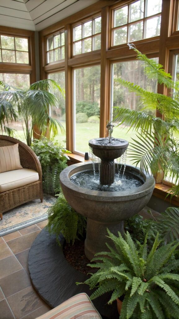 Water features also introduce an element of nature, complementing the sunroom’s connection to the outdoors. Choose a design that fits the overall aesthetic of your space, whether it is modern or more traditional. Ensure proper placement to avoid splashing and maintain humidity levels.