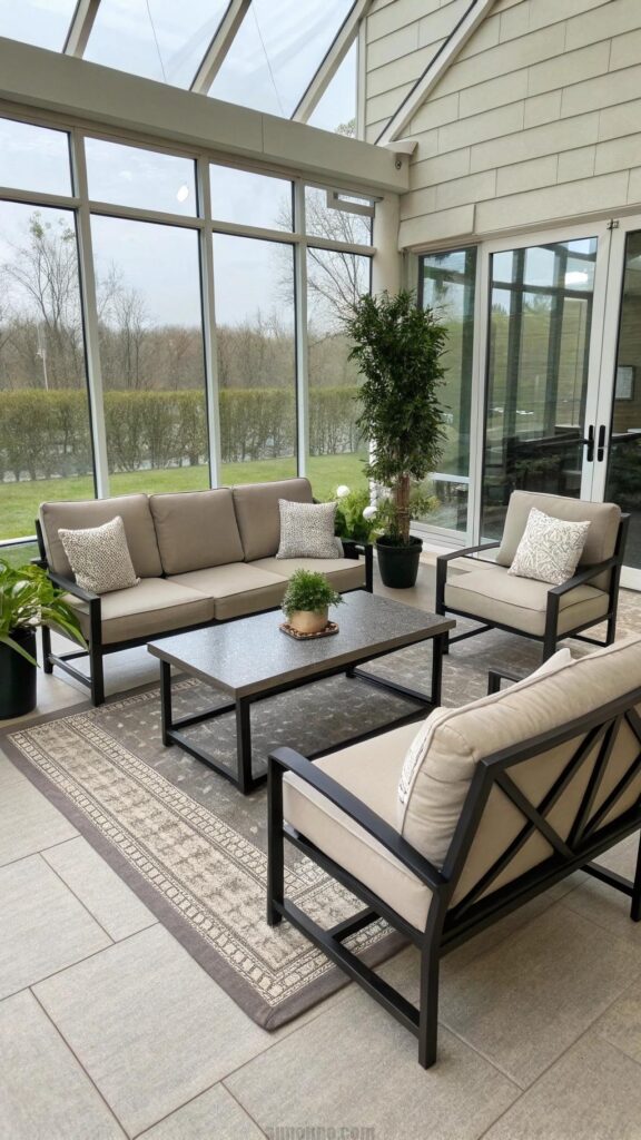 Even if your sunroom is fully enclosed, using outdoor-grade furniture can be a smart choice. These pieces are designed to withstand sunlight, humidity, and temperature fluctuations, ensuring longevity. Materials like aluminum, synthetic wicker, or treated wood are excellent options.