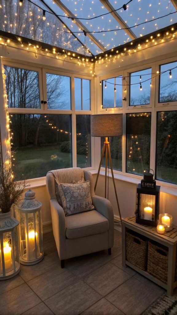 Beyond natural light, decorative lighting can significantly enhance the ambiance of your sunroom, especially during evenings. String lights or fairy lights can create a magical and whimsical atmosphere. Place them along the ceiling beams or around window frames for a soft glow.