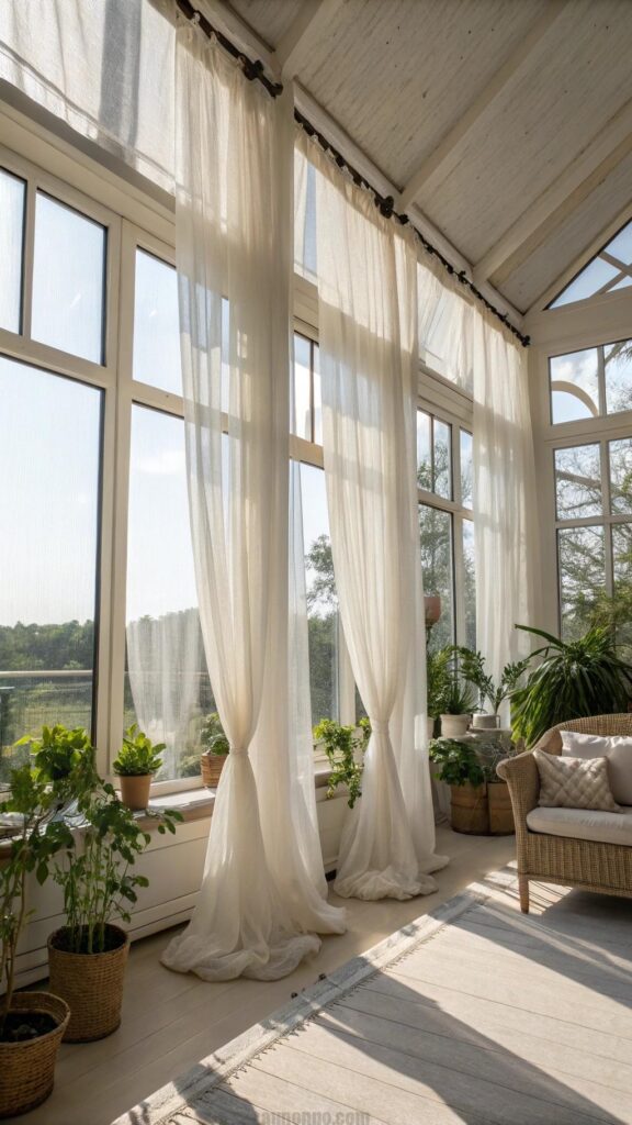Light and sheer curtains are perfect for sunrooms, allowing natural light to filter through while providing a touch of privacy. They help to diffuse harsh sunlight, creating a softer, more inviting glow. Choose fabrics like linen, cotton, or voile for an airy feel.