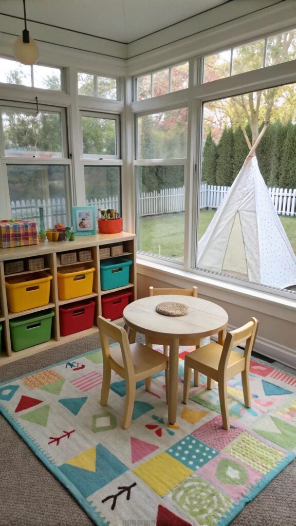 Incorporate colorful storage bins or baskets to keep toys organized and easily accessible. A small table and chairs can be used for arts and crafts or puzzles. Natural light in the sunroom makes it an ideal environment for creative play and learning.