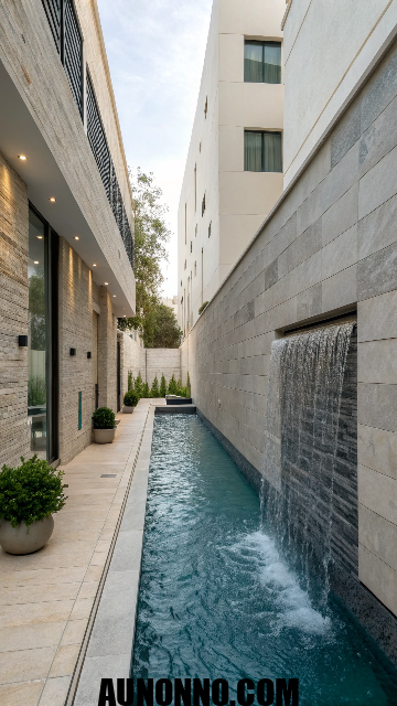 Narrow courtyard pools maximize long narrow spaces between buildings or property lines. These pools typically measure 10 to 15 feet wide but extend 30 to 50 feet in length, creating efficient swimming corridors in challenging layouts. The slender profile fits into side yards, courtyards, and other narrow areas where traditional pool shapes won’t work.​
