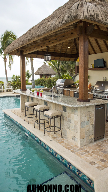 Integrated outdoor kitchens and swim-up bars transform your pool area into a complete entertainment venue. A swim-up bar built into the pool edge allows swimmers to enjoy refreshments without leaving the water. The bar typically includes submerged stools and a counter at water level with service area and storage on the deck side.​