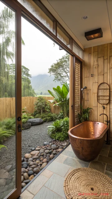Indoor bathroom functions remain protected while bathing extends into nature. High privacy walls, strategic plantings, or remote locations ensure comfort without exposure.