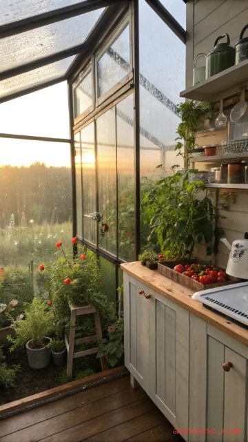 The greenhouse area can serve as a sunroom or additional living space beyond its agricultural function. Opening windows and vents prevent overheating during summer months.