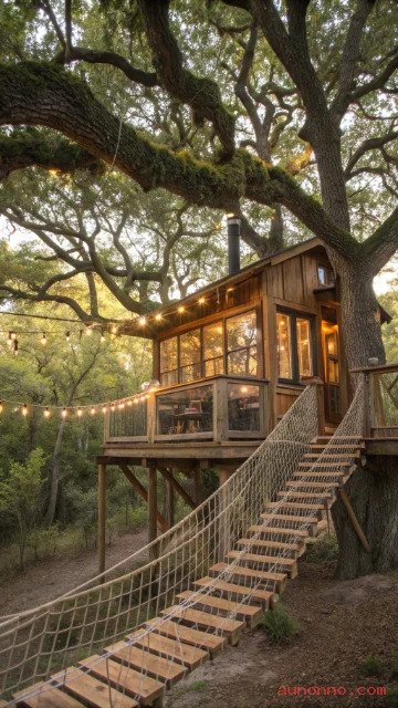 Rope bridges, spiral staircases, and clever access systems add adventure to everyday living. This design captures childhood dreams while providing adult comfort and functionality.
