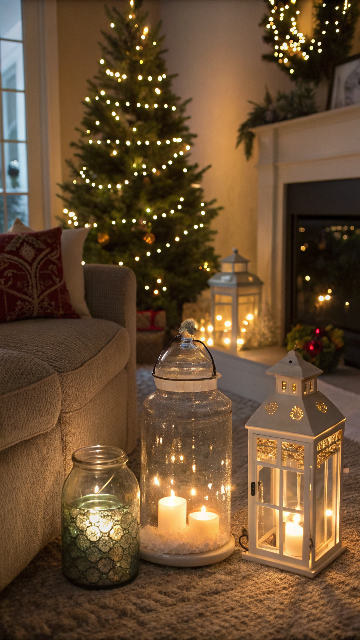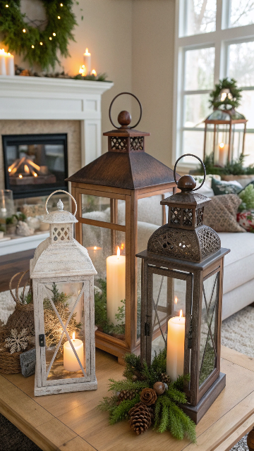 Decorative lanterns can add a charming touch to your living room decor. Use lanterns made of metal, glass, or wood and fill them with candles, fairy lights, or seasonal greenery. Place them on your mantel, coffee table, or windowsills to create a warm and inviting glow.