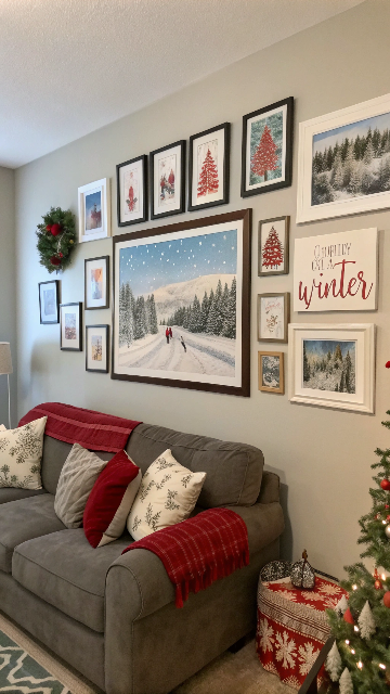 Switching out your regular artwork for seasonal pieces can instantly transform your living room. Look for prints or paintings that feature winter scenes, holiday motifs, or festive colors. You can also create a gallery wall with a mix of holiday-themed art and family photos.
