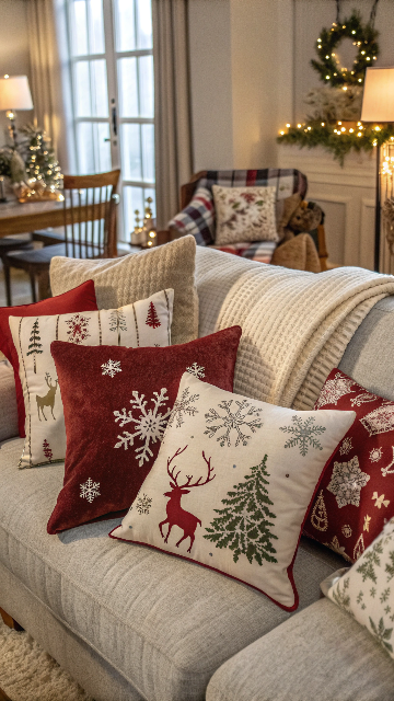 Adding festive throw pillows to your living room can instantly elevate your holiday decor. Look for pillows with Christmas-themed designs, such as snowflakes, reindeer, or holiday greetings. Mixing and matching different textures, like velvet and knit, can add depth and interest to your seating area.