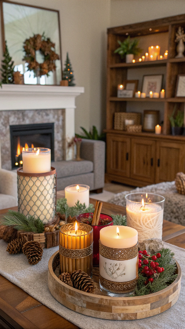 Candles are a wonderful way to add warmth and ambiance to your living room during the holidays. Choose scented candles with festive fragrances like cinnamon, pine, or vanilla to create a cozy atmosphere. Arrange them on your coffee table, mantel, or shelves for a beautiful display.