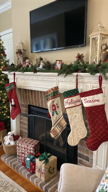 Consider filling the stockings with small gifts, treats, or holiday-themed items to surprise your family members. This not only adds to the excitement of the season but also enhances the festive look of your living room. You can also coordinate the colors and patterns of the stockings with your overall holiday theme.