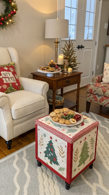 Consider adding a small holiday-themed book or a festive centerpiece to complete the arrangement. You can also incorporate seasonal colors and textures to tie everything together. This not only adds to the decor but also provides a functional space for snacks and drinks during gatherings.
