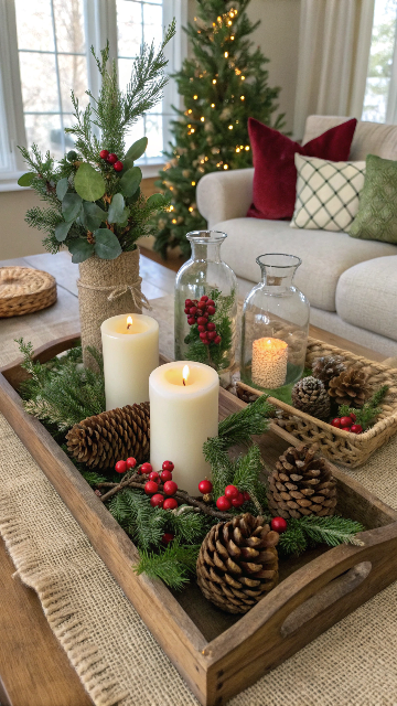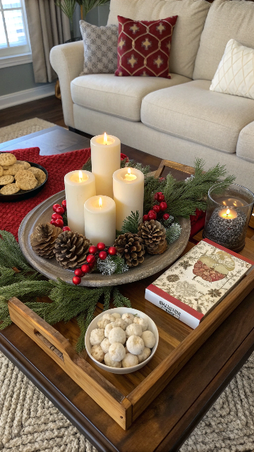 Transform your coffee table into a festive focal point with Christmas-themed decor. Use a decorative tray to group items like candles, ornaments, and seasonal greenery. This creates an organized and visually appealing display that enhances the overall look of your living room.
