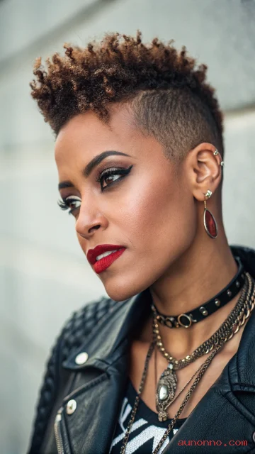 This daring look captures attention anywhere. It expresses individuality and creative freedom.