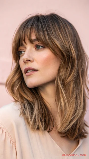 This look works for medium to long hair and adds a breezy balance. Style with a round brush to shape the bangs and add natural lift. Spray lightly for extra hold.