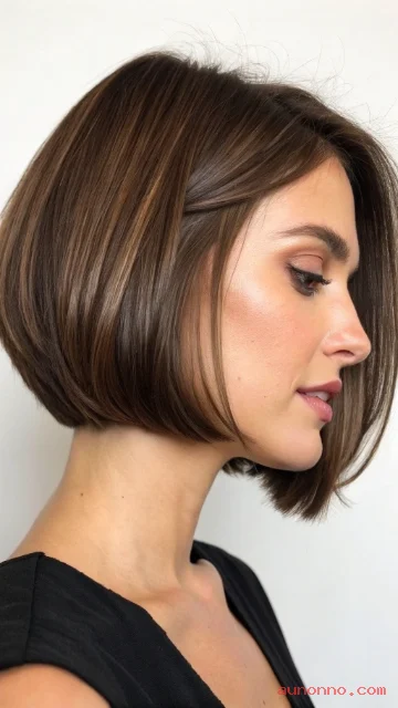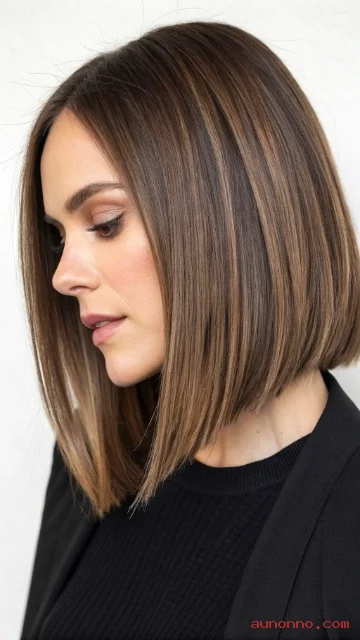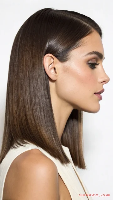 Flat-ironing enhances the smooth shape. Gloss spray adds healthy shine. It pairs beautifully with subtle highlights.