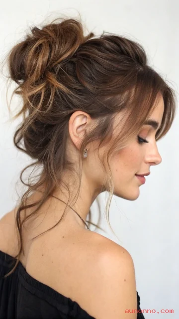 The messy bun-length cut lands below shoulders for effortless styling. It’s long enough to tie yet short enough to manage easily. The loose ends add light shape.