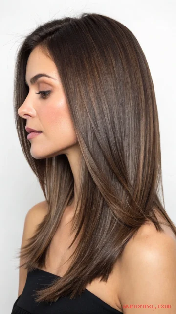 The straight layered cut focuses on control and smoothness. Layers sit lightly, adding body without curls. It’s sleek, balanced, and versatile.