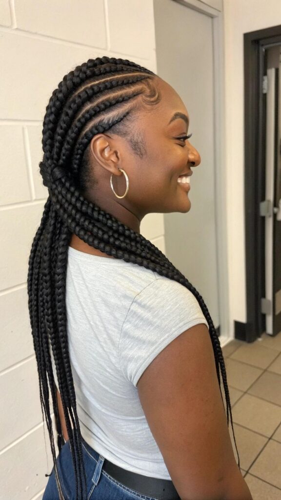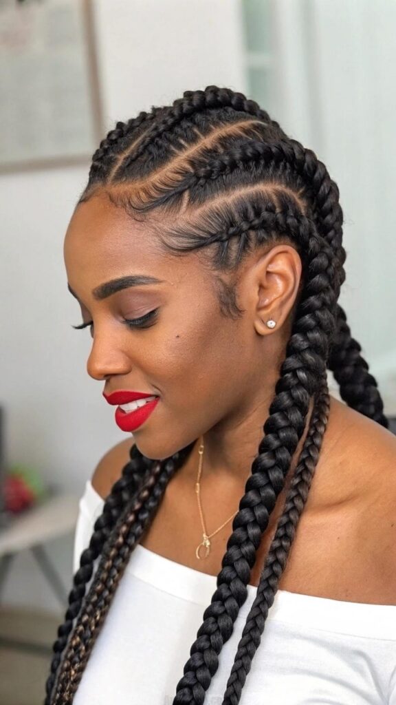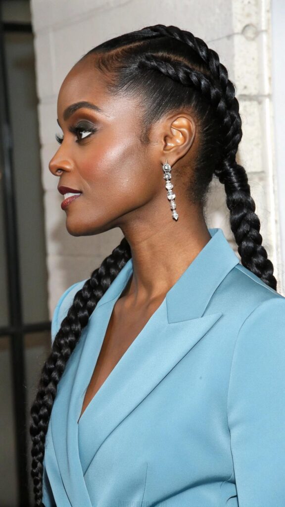 The classic straight-back two braids are a go-to style for many Black women. This look features two neat braids that run straight down the back of the head. It’s simple, elegant, and perfect for any occasion.