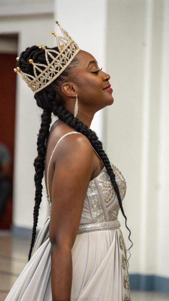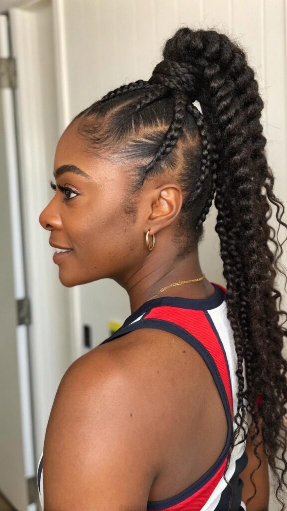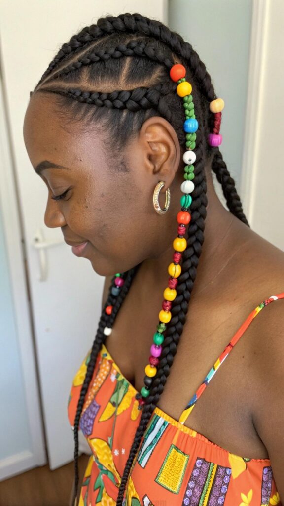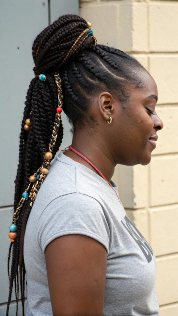 A high ponytail and beads add a playful and trendy touch to two braids. This style is perfect for casual outings or when you want a fun, youthful look. It’s easy to achieve and looks great on everyone.