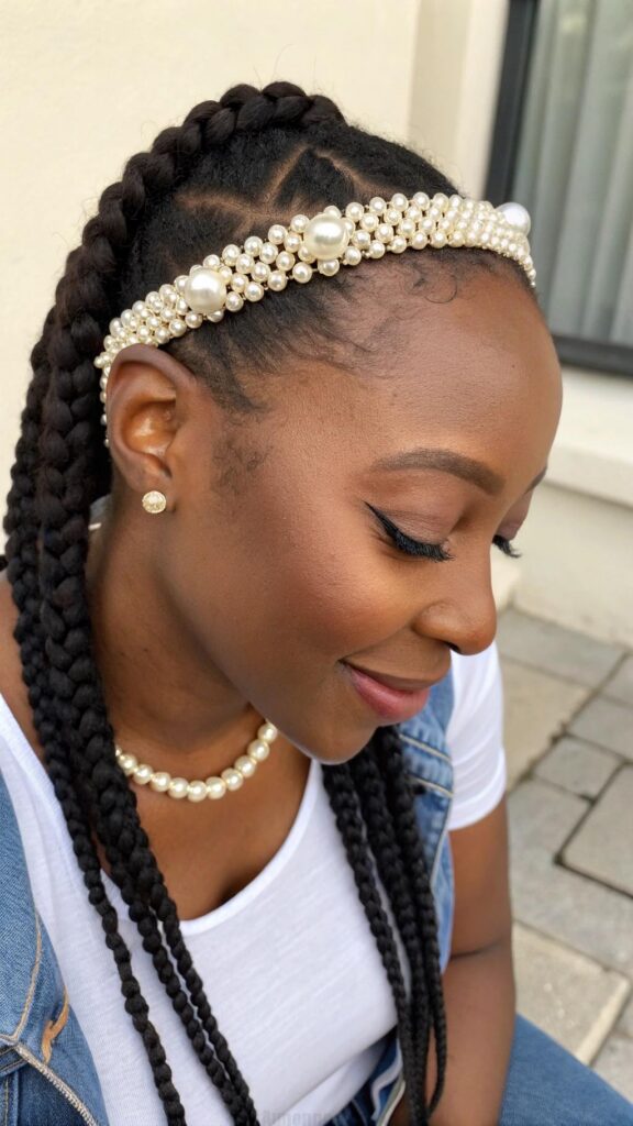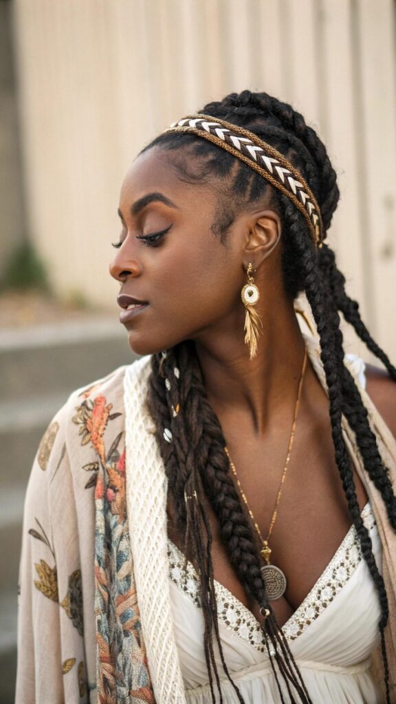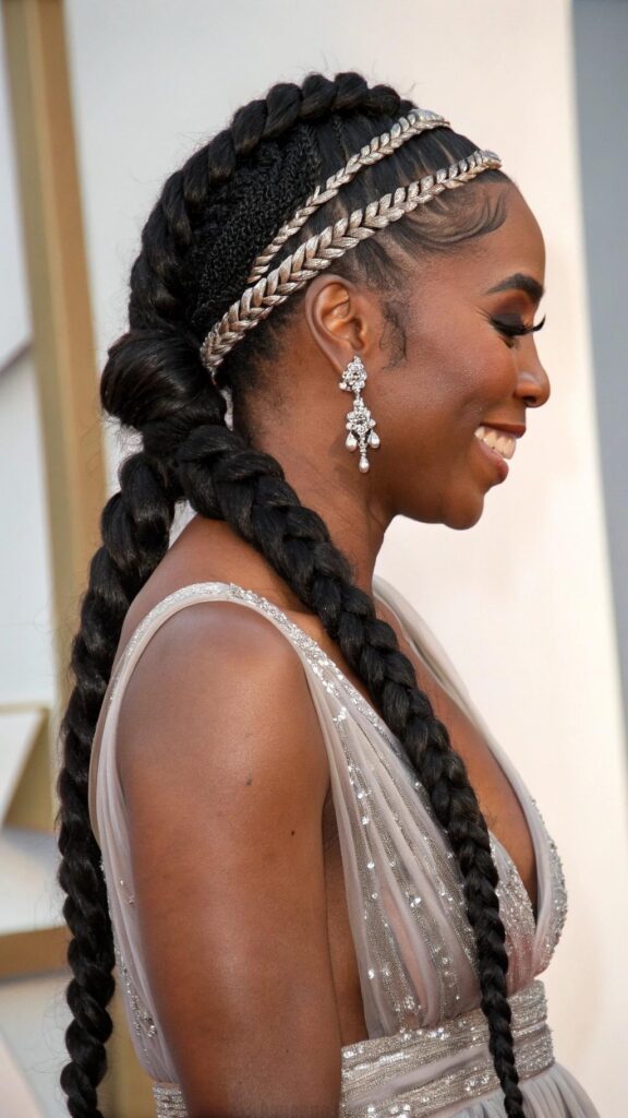 A headband adds a touch of elegance to two braids. This style is perfect for those who want a simple yet stylish look. It’s great for everyday wear or special occasions.