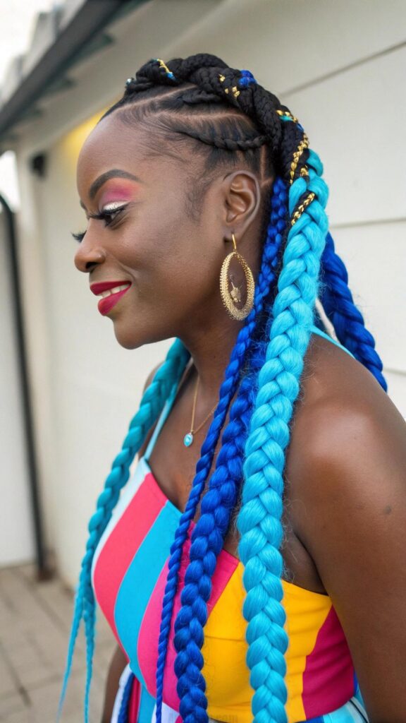 Attach colored extensions to your natural hair before braiding. Braid the hair as usual, ensuring the extensions are evenly distributed. This style is perfect for festivals or parties.