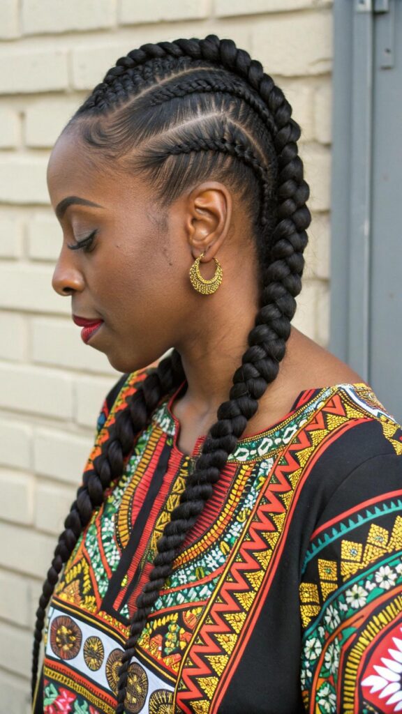 Tribal patterns add a unique and cultural touch to two braids. This style involves intricate designs braided into the hair, showcasing creativity and heritage. It’s a bold choice for special occasions.