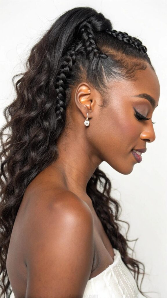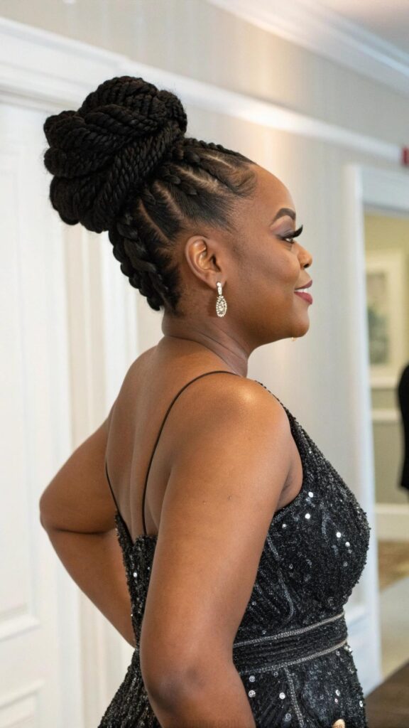 A high bun adds height and drama to two braids. This style is perfect for formal events or when you want to make a statement. It’s elegant and easy to achieve.