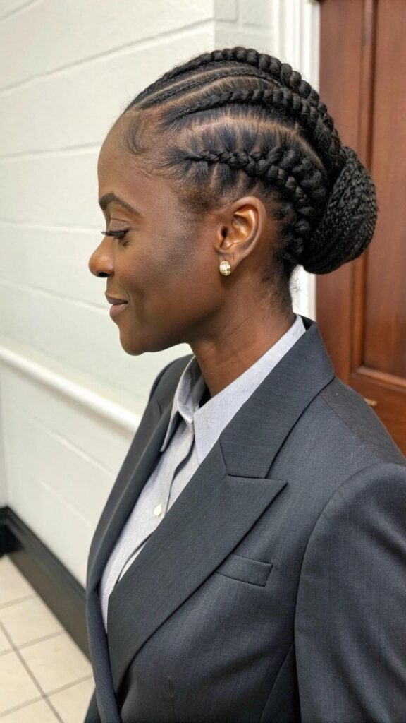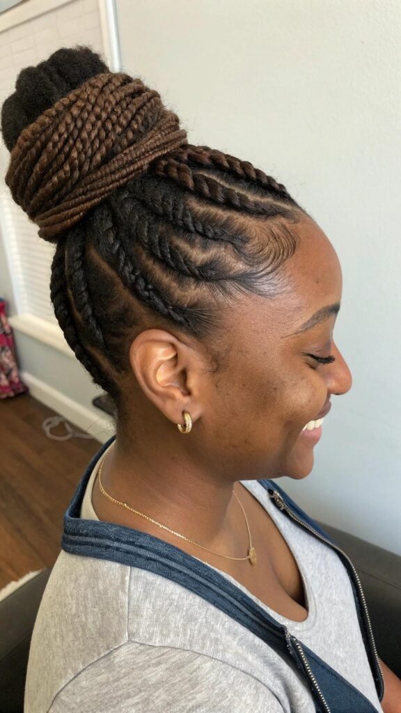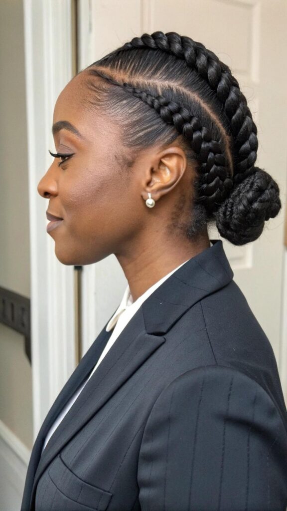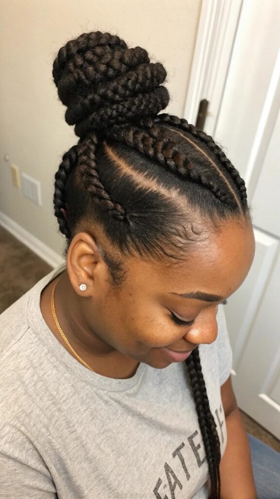 Start by creating small cornrows at the crown of your head. Gather the rest of your hair into two sections and braid them. This style is both stylish and functional, keeping your hair secure.
