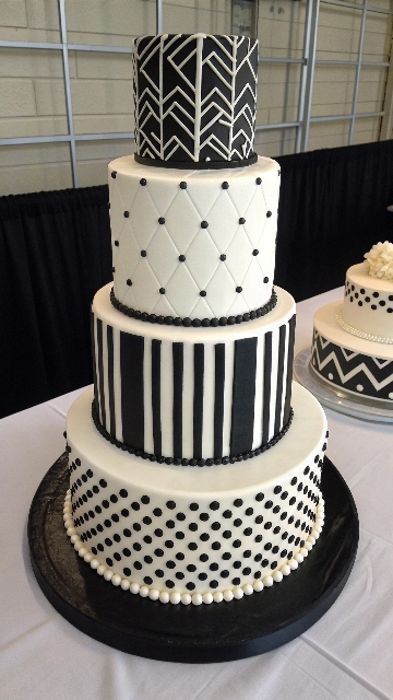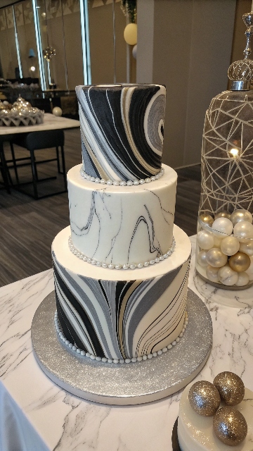 Pair this cake with black and white table settings or bold decor for a cohesive look. The black and white design is both dramatic and chic. It’s a great way to make a statement on your special day.