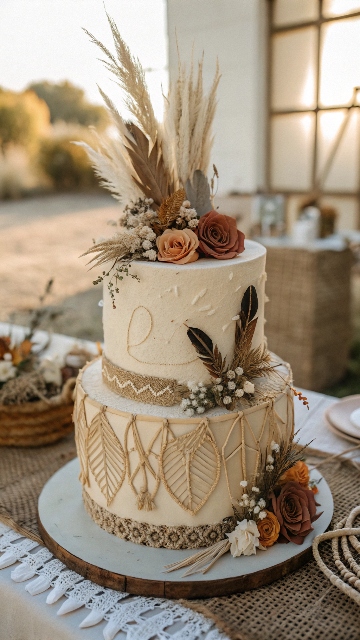 Pair this cake with woven table runners or mismatched decor for a cohesive look. The bohemian design is both natural and stylish. It’s a great way to create a laid-back and artistic vibe on your special day.